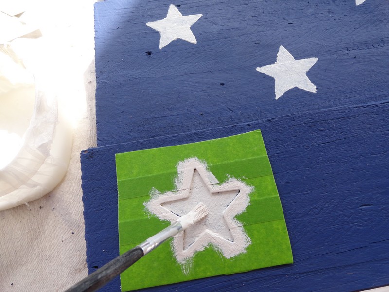 4. Used the Frog Tape again to mask off first my white stripes and then my red stripes, allowing the paint to dry in between. With eight boards, I simply couldn't make 13 stripes work, so I forced myself to settle on 12 and keep going. Those of you who know me, this was a feat in itself!